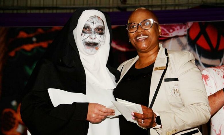 Emperors Palace’s VIP Services Manager, Sheila Manamela (right) of Kempton Park congratulates Jaqueline Smith (left) of Elspark on winning the best-dressed title at a VIP Halloween function hosted by the resort and casino on October 29.