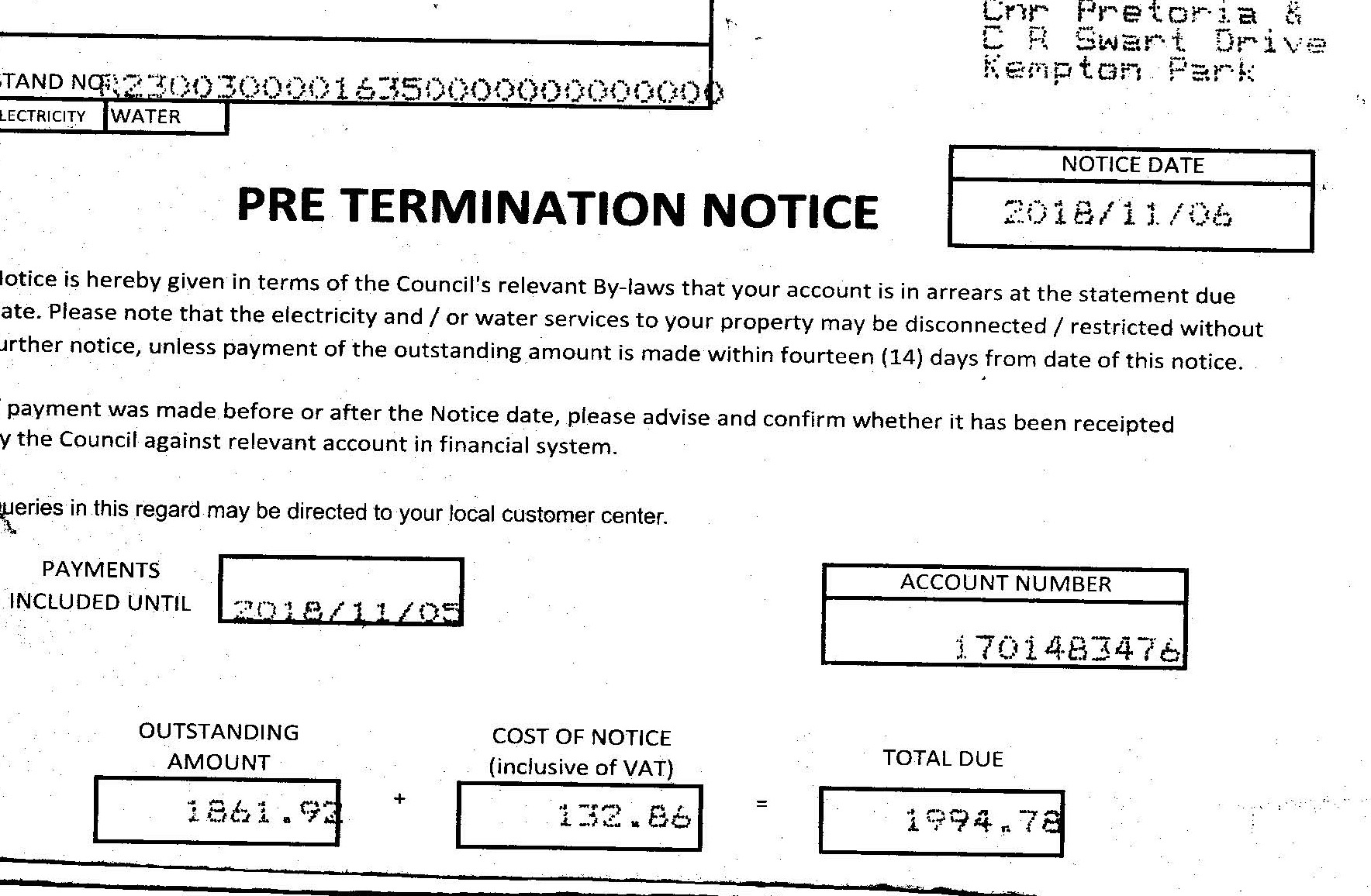 For a few months now we have been receiving pre-termination notices from the municipality and each one costs about R132.86.