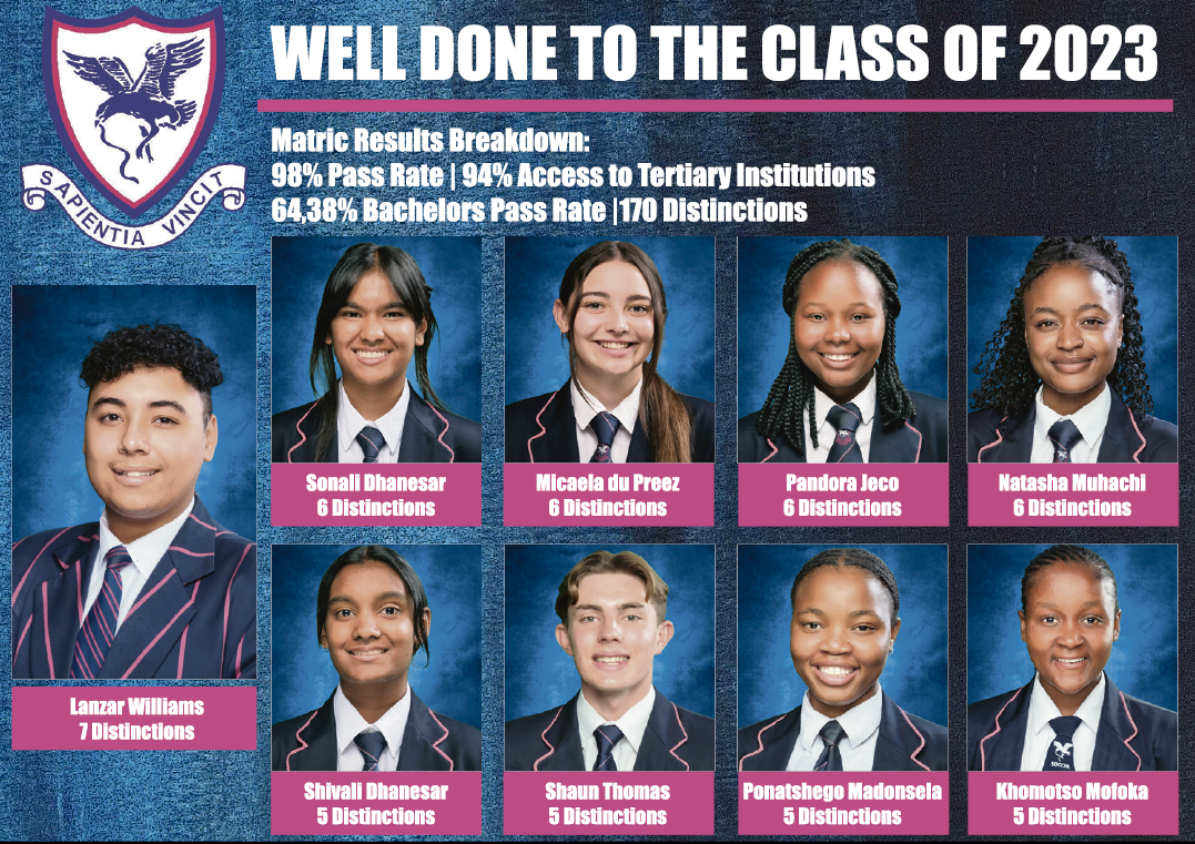We are exceptionally proud of the class of 2023. We boast a pass rate of 98%, 64% bachelor pass rate, and 170 distinctions – which is a clear indication that the work and dedication of our learners and educators have paid off. We wish our learners all the best in their future endeavours.