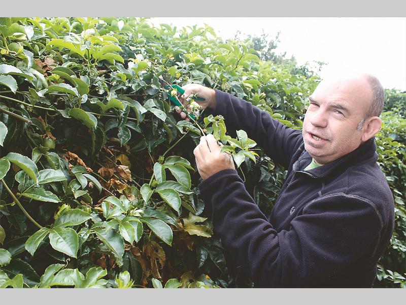 Welige granadillaplant rank byna ‘n motorhuis toe