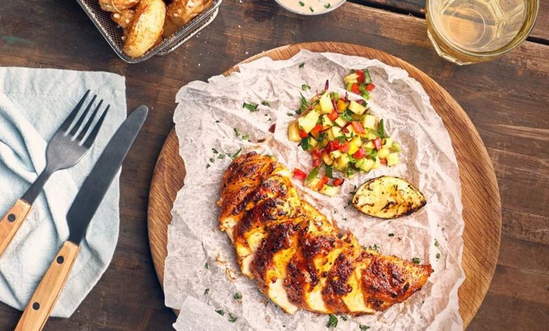 You’ll need: 5g Robertsons Paprika; 20g Parmesan cheese, grated; 3g red chilli, finely chopped; 1g Robertsons Cayenne Pepper; 10 ground coriander; 4 – 6 chicken breasts, scored; 5g Robertsons Chicken Spice; oil, for drizzling; 100ml Knorr Professional Mozambican Peri-Peri Marinade & Basting; 50ml water.
