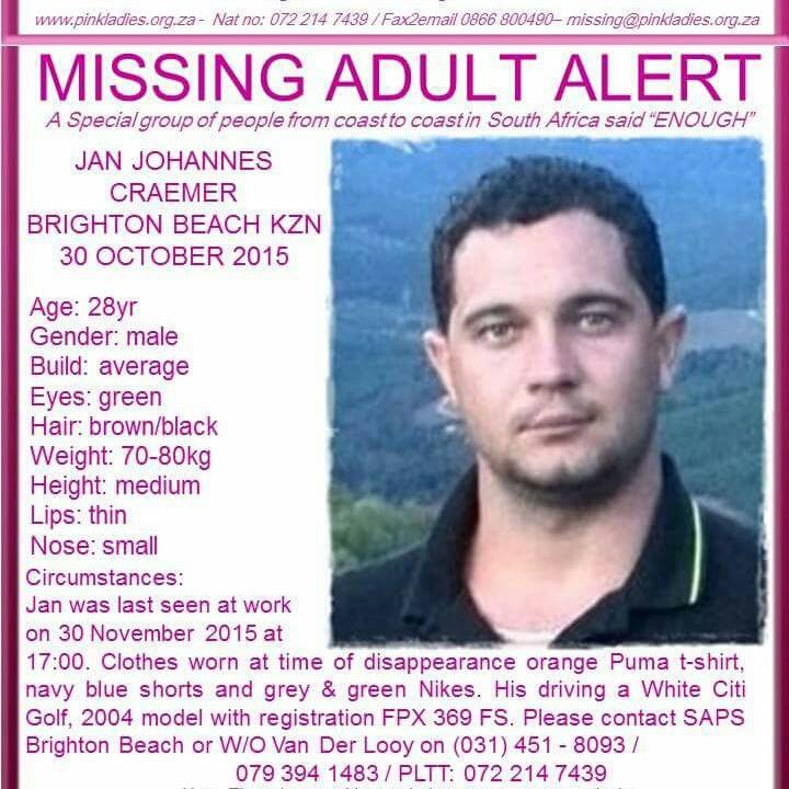 Craemer had been reported as missing at the Brighton Beach Police station in Durban on 30 November.