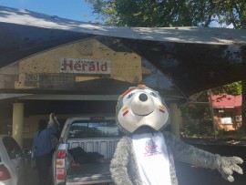Misty River Spur's mascot escaped during lunch hour to surprise Letaba Herald's staff at their offices .
