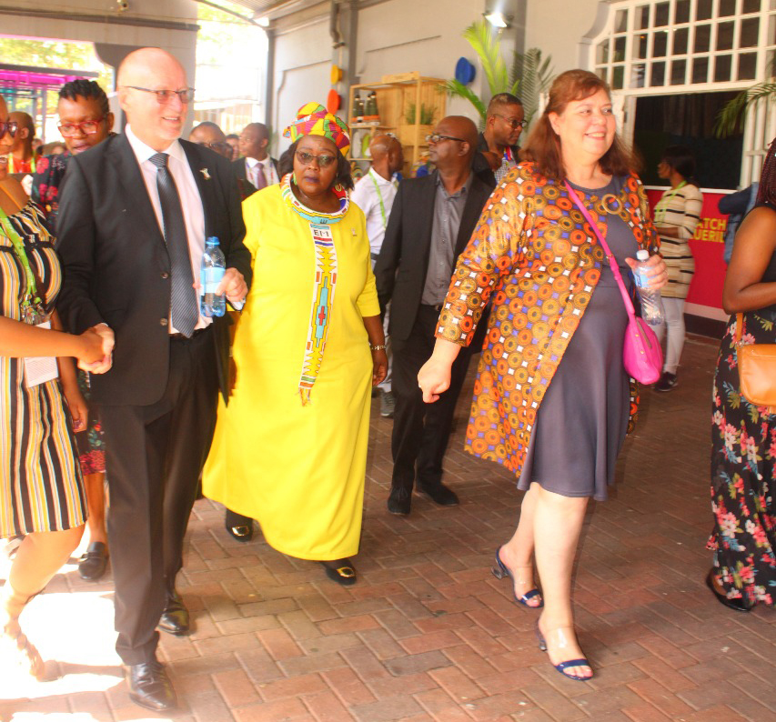 Tourism Minister Derek Hanekom with Deputy Minister Elizabeth (yellow dress) Thabethe visiting different exhibiting stalls.