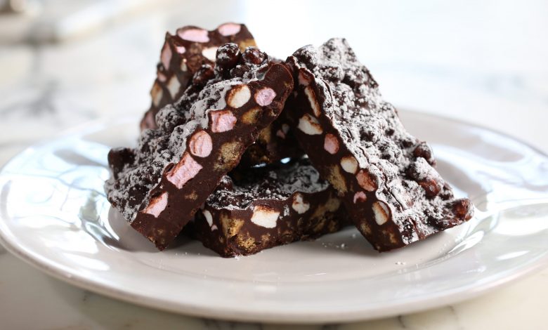 You’ll need: 125g dark chocolate; 30g mixed, chopped nuts; 30g salted pretzels, broken into small pieces; 25g mini marshmallows