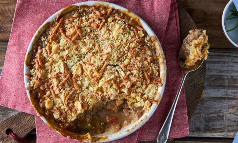 You’ll need: 80g butter; 375ml self-rising flour; 60g cheddar cheese, grated; 4ml salt; 4ml pepper; 1ml mustard; 1 onion, chopped; 20ml oil; 1 red pepper, chopped; 125ml green beans, sliced; 2 tins tuna drained; 1 packet Royco Chicken a la King Cook-in-Sauce; 400ml milk/.
