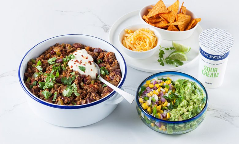 Serve with Lancewood sour cream, grated Lancewood cheddar, coriander, chillies, tortilla corn chips, nachos, Doritos or tortilla wraps, guacamole and corn salsa.