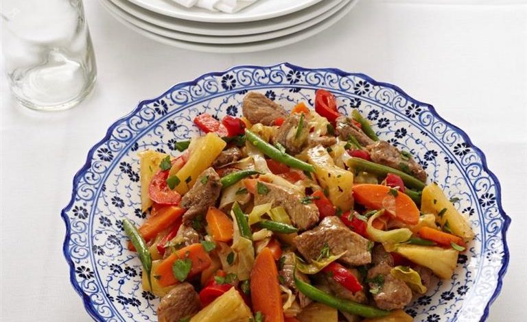 You’ll need: ½ tbsp cornflour; 5 tbsp strong Rooibos tea; 3 tbsp lemon juice or white grape vinegar; 1 tbsp soy sauce; 2 tbsp olive or canola oil; 500g pork shoulder or leg, removed from the bone, cut into strips and excess fat removed; 1 red or green pepper, seeded and sliced; 2 carrots, peeled, halved lengthwise and diagonally sliced; 4 tsp finely grated fresh ginger; 1 small pineapple, peeled, sliced and cut into triangles; ¼ cabbage, shredded; 100g green beans, halved; black pepper to taste; handful fresh parsley or mint, chopped.