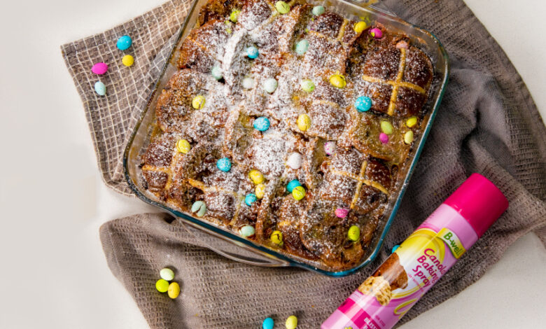 You’ll need: B-Well Canola Baking Spray; 6 hot cross buns, sliced in half; 4 medium free-range eggs/ 5 Tbsp cornflour; 1 tsp vanilla extract; 100g butter, spread on the hot cross buns; 160g caster sugar; 1 orange, zest of the whole orange; ¼ cup apricot jam or a handful of chopped dried apricots; 2 cups cream/ coconut cream; 1 cup milk/ plant milk; 3 Tbsp cognac/ liquor /rum (optional); a handful of choc chips or mini Easter eggs, optional.