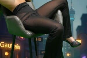 She wears a mid-length, slightly sparkly body con dress with angular top straps and varying green designs, showcasing her long gorgeous legs.