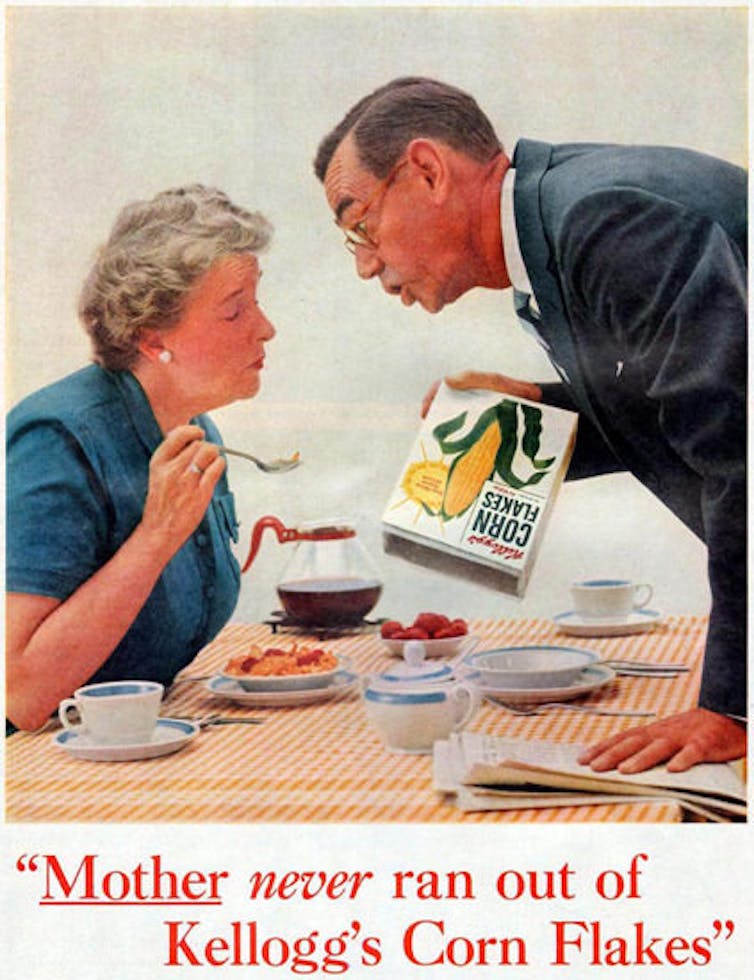 You could see this in midcentury ads, like the one showing an irritated husband saying “Mother never ran out of Kellogg’s Corn Flakes.”