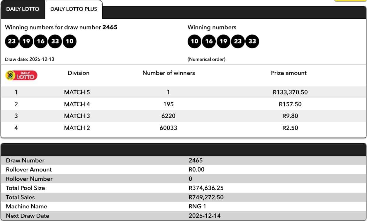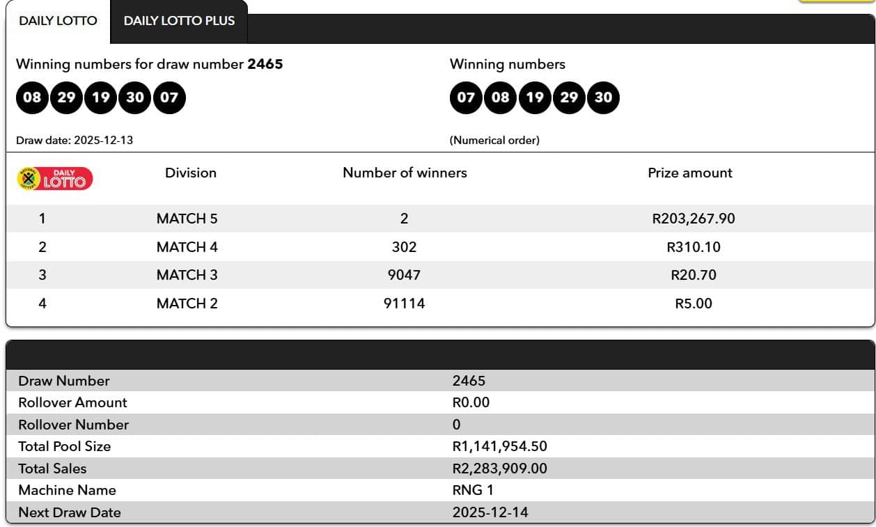 Daily Lotto and Daily Lotto Plus results for 13 December 2025: