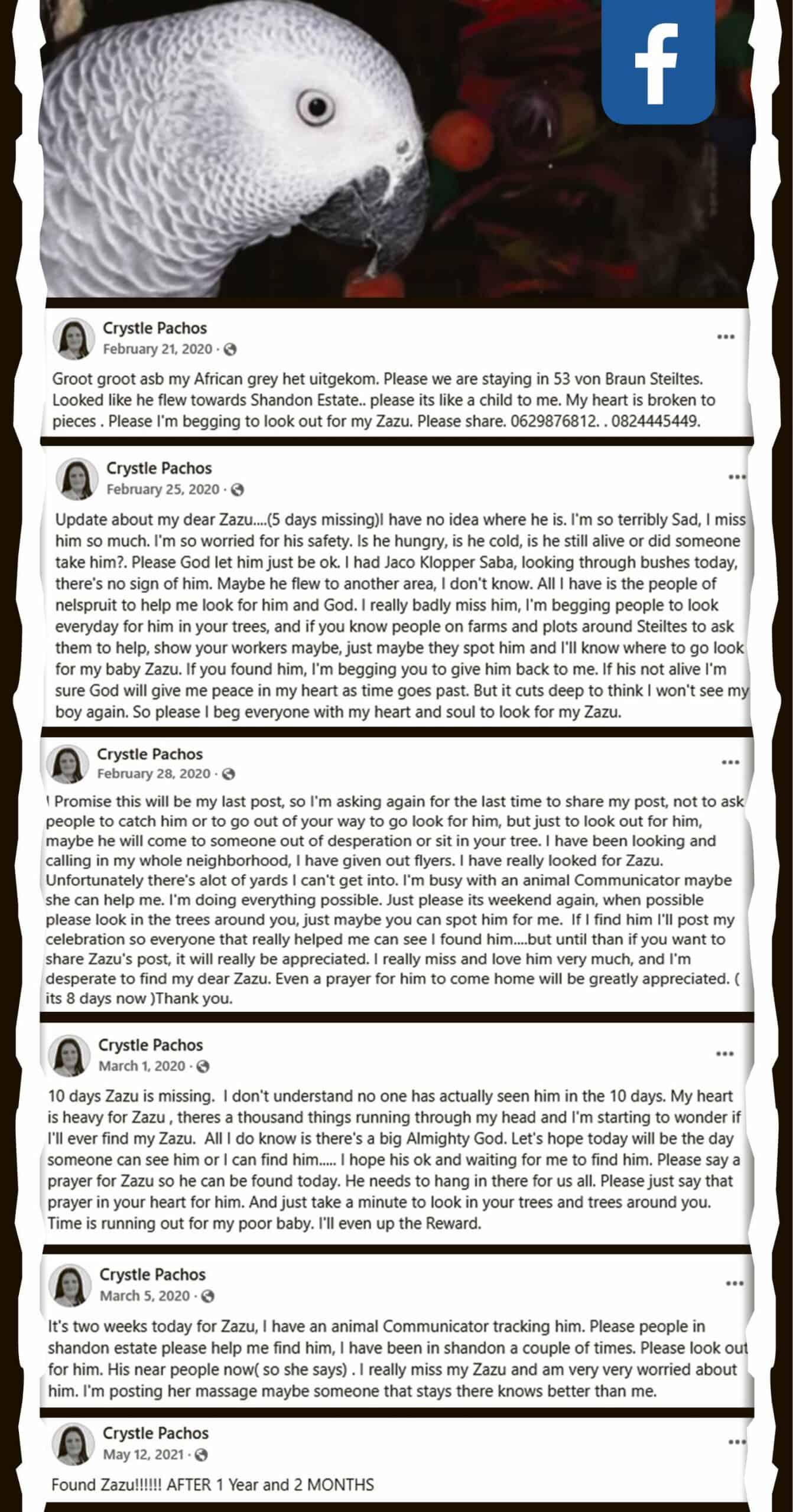 The conflict began on February 21, 2020, when Steiltes resident Pachos reported her bird missing. She launched a relentless social media campaign to recover Zazu, offering a R1 000 reward, and posting almost daily pleas for assistance.