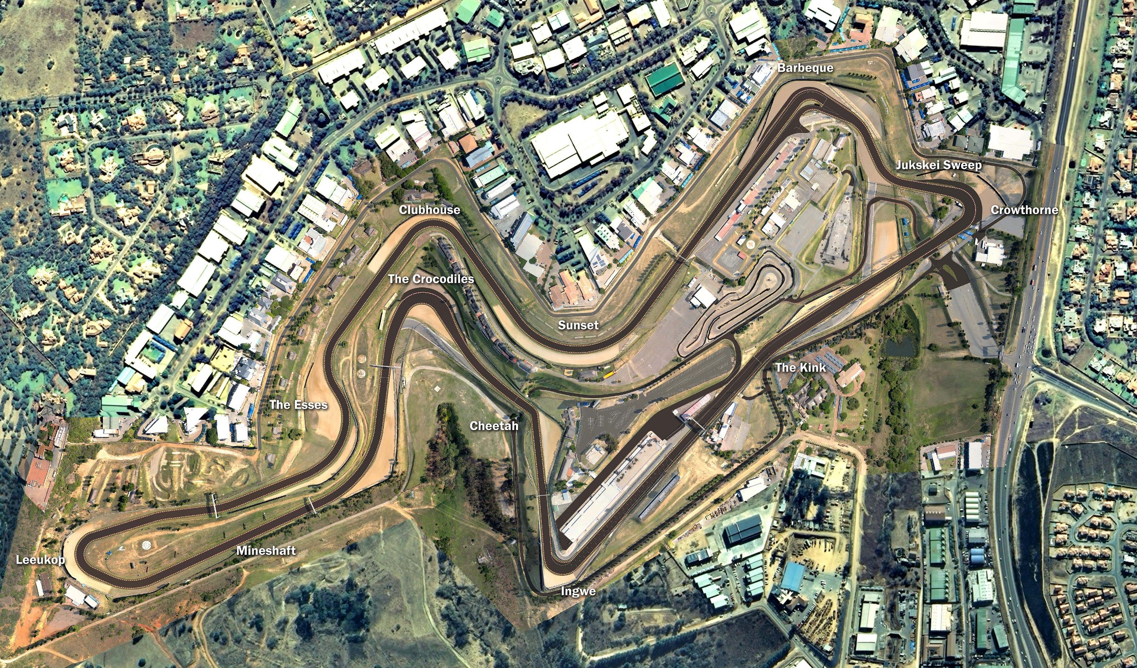 The revised circuit will once again revive these great turn names. After the starting line the circuit drops into a new turn 1, The Kink. Turn two will be named Crowthorne, the two right- and left-handed curves following will be named Jukskei Sweep. The new turn five now named Barbeque. Then Sunset, followed by Clubhouse, the Esses and Leeukop. The Mineshaft follows and turns, a new turn 13 will be called The Crocodiles. Next will be a very fast corner called Cheetah. Turn 15 will be be called Ingwe and then follows the start and finish.