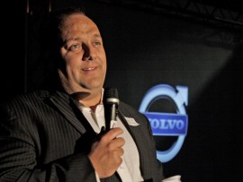After some “words of Volvo” dealer principal Christo Leeuwner introduced short video clips on this very exiting car and then it literally burst though the video screen into the showroom.