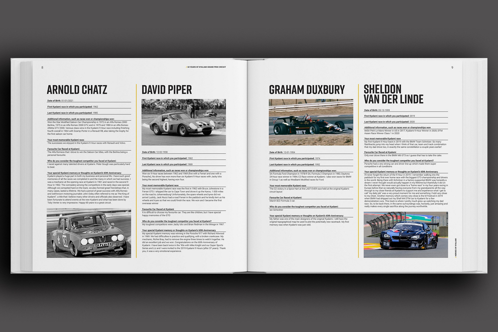 The book is divided into four main sections. The reader is first treated to 120 pages covering Kyalami’s incredible 60-year story from where it all began in 1961 and concluding with the 2021 Kyalami 9 Hour. Each year is summarised, with international race results and South African circuit racing champions listed, and illustrated by period images.