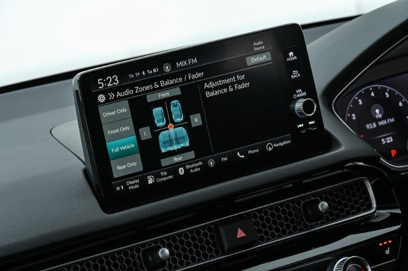 The Civic RS is equipped with Honda’s nine-inch advanced HMI display Audio with Apple CarPlay (wireless) and Android auto connectivity, which has been designed with simplicity and efficiency in mind. This is the same system used in the Honda Fit and features a volume knob, physical buttons for home and back functions, large icons, a fast processor for lag-free performance, and a simplified navigation structure with fewer embedded menus. A wireless smartphone charger and USB ports front and rear are also standard.