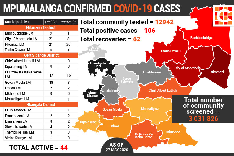 The Mpumalanga Department of Health confirmed that the number of Covid-19 cases in Mpumalanga has increased to 106.