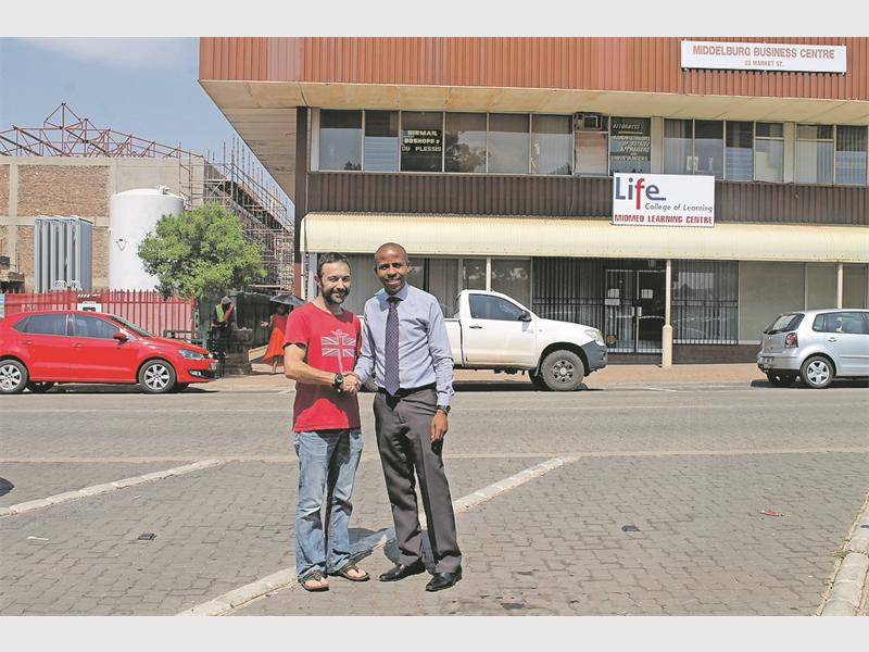 Property owner and Architect Mr Tobias van Loggerenberg with President of the Middelburg Chamber of Commerce Adv Mtho Xulu. Behind the two gentlemen is a building belonging to Mr van Loggerenberg, the building will be modernized as part of the towns revamp programme.