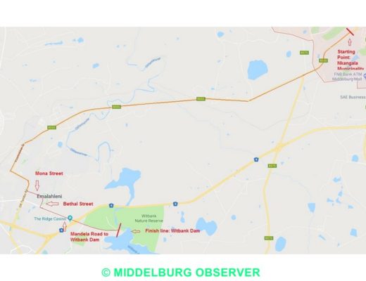 Runners will take off at the Nkangala District Municipality in Middelburg and will then proceed to run along the R555(Old Witbank road). The course will take them to OR Tambo Street where the participants will then turn left into Mona Street and then right into Bethal Street. From there on, the joggers will turn left in Mandela road and proceed to Witbank Dam.