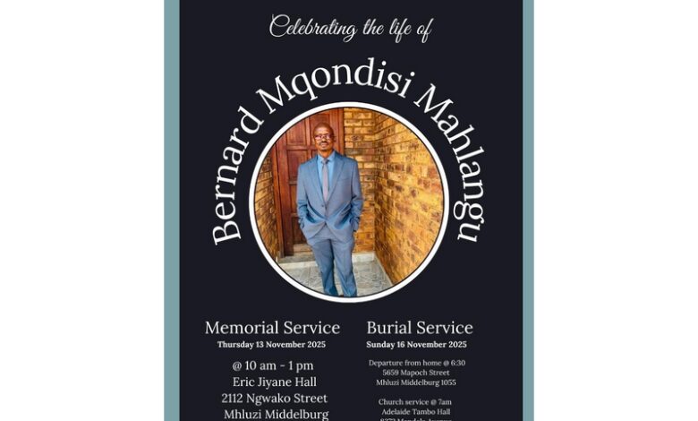 A memorial service in honour of Bernard’s life and the legacy he left behind will be held at the Eric Jiyane Hall in Mhluzi tomorrow (Thursday) at 10:00.