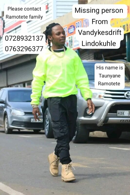 Anyone with information regarding Taunyane Ramotete’s whereabouts is urged to contact the South African Police Service or reach out to his family directly on 072 893 2137 or 076 329 6377.