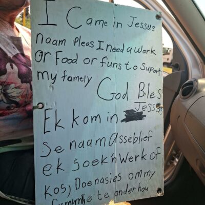 “I came in Jessus naam please I need a work or food or funs to suport my famely, God bles. Ek kom in Jessus se naam asseblief ek soek ’n werk of kos doenasies om my famelie te onderhou”.