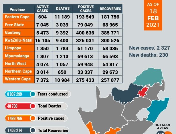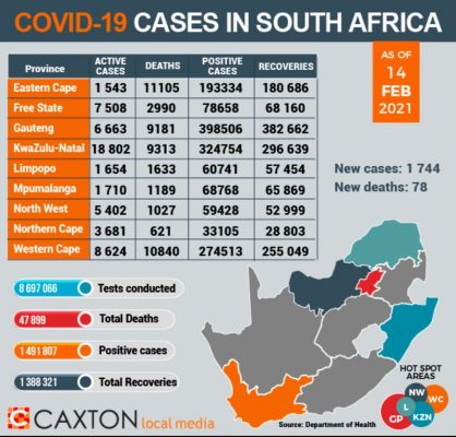 Daily new case numbers this week, according to the Department of Health, have varied from 2 387 on 18 February to 1 102 on 15 February with an average of 1 740 new cases over the last five days. Overall, the number of deaths due to Covid-19 remain high and 887 people have passed away due to the virus in the past five days.