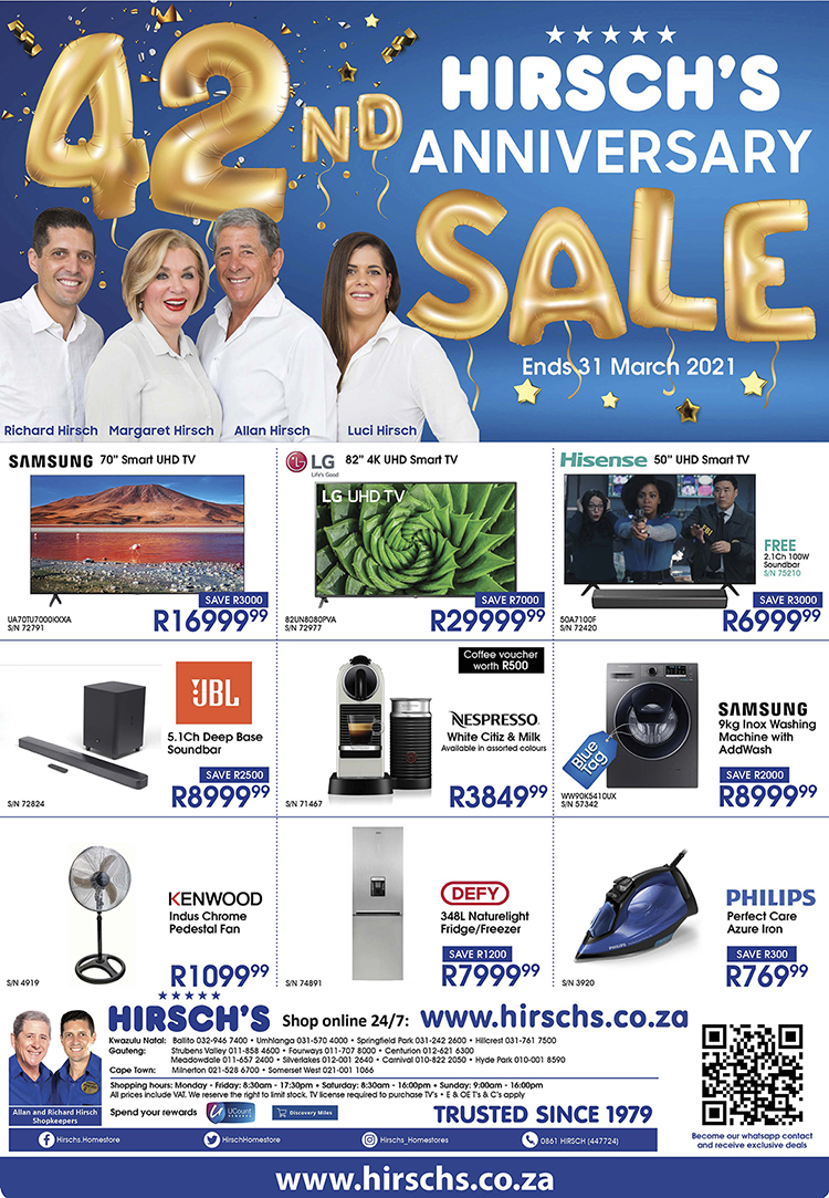 In celebration of Hirsch’s 42nd Anniversary, in addition to offering amazing specials on a wide range of Electrical and Household appliances Hirsch’s are giving away a special limited edition DSTV Explora 2 Decoder.