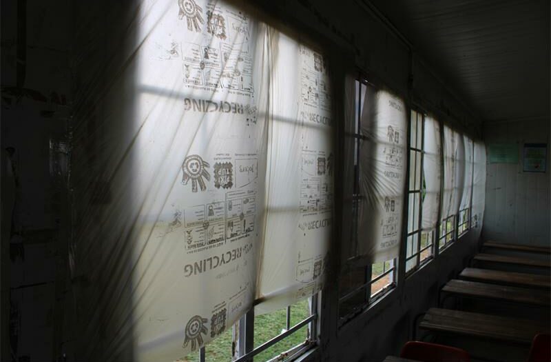 The school is in a state of disrepair, with some of the container classrooms’ broken windows covered with plastic garbage bags to try and prevent rain and strong winds from getting in the classrooms, while the toilets are unhygienic and have no privacy.