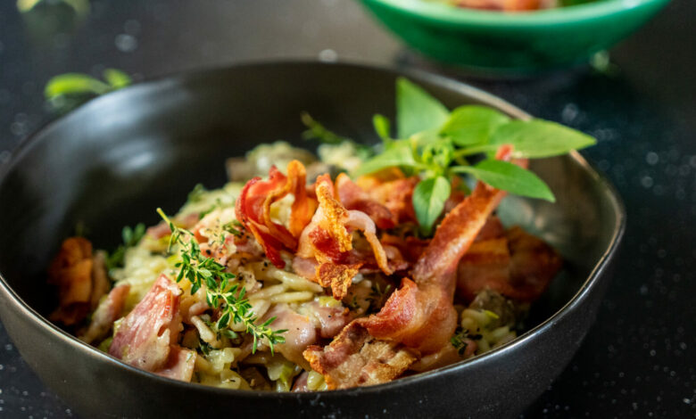 You’ll need: 200g Eskort Rindless Streaky Bacon, sliced into squares; 500ml pasta rice; 125ml leeks, chopped; 45ml thyme, chopped; 750ml mushrooms, chopped; 1 clove garlic, chopped; 500ml vegetable stock; 500ml water; 250ml cream; 125ml Parmesan cheese, grated; salt and pepper; olive oil for cooking.