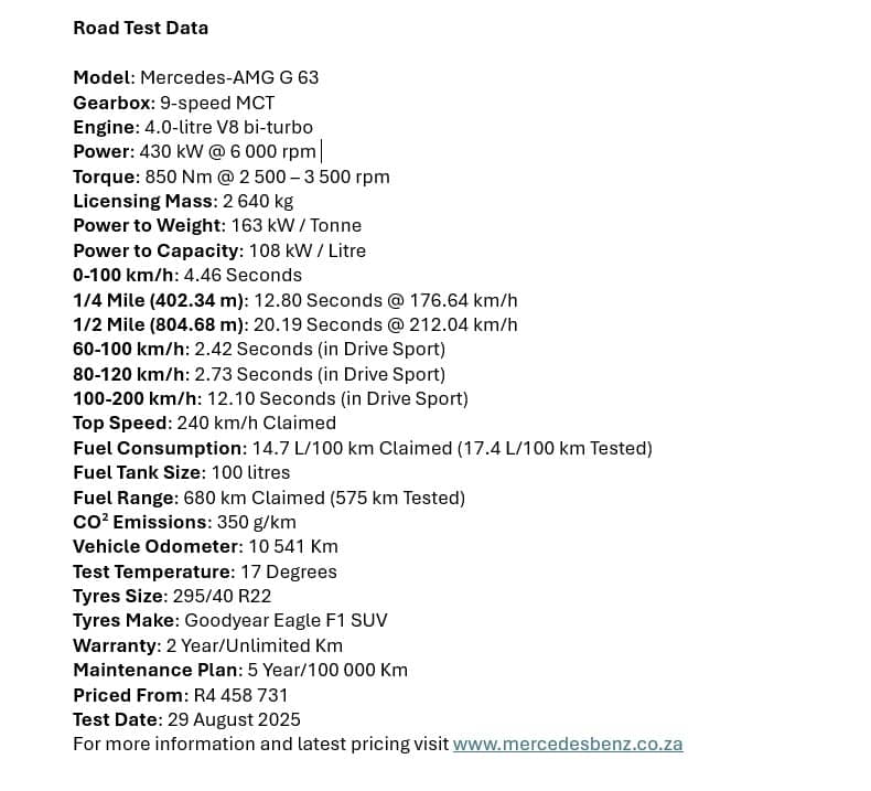 Based on its comparatively light mass of 2 640 kg versus its sibling’s 3 085 kg, the G63’s reduced torque output, but greater power still paid off as it completed the 0-100 km/h sprint in 4.4 seconds versus the EV’s 4.6 seconds with Road Test Editor Mark Jones at the wheel.