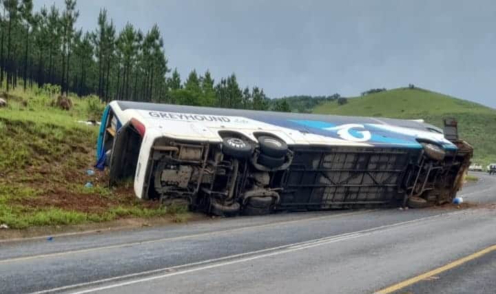 A bus overturned on the R33 near eMkhondo, killing five people and injuring more than 20 others.