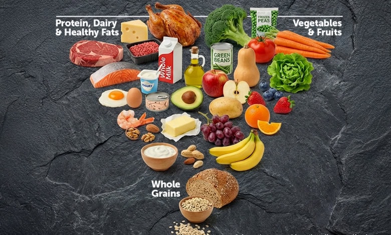 Ultra-processed foods have no meaningful place in anyone’s diet. The emphasis is firmly on food that looks like food: meat, fish, eggs, vegetables, fruit, dairy, less processed grains, and natural fats.