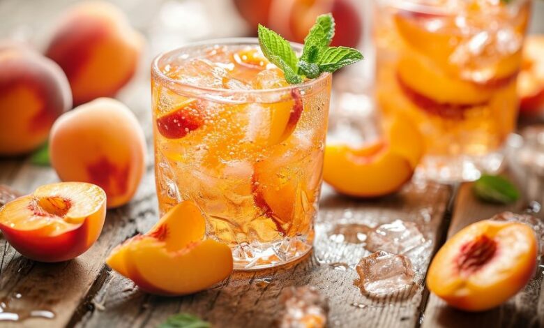 - Garnish with a fresh peach slice and a sprig of mint.