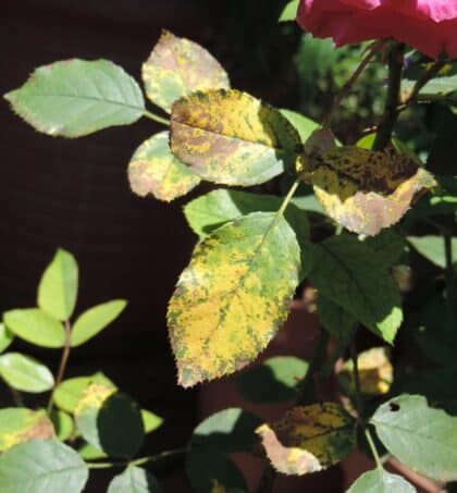 Mottled yellow leaves usually means an infestation of red spider. If you look on the underside of the leaves you will see tiny specks that are the rede siders and might even see tiny spider webs. Spray with a double dose of Ludwig’s Insect Spray making sure to drench the underside of the leaves where the mites live and multiply. Repeat the spray a week later to deal with any mites that might have hatched. This is an organic spray that contains natural ingredients like garlic and canola oil.