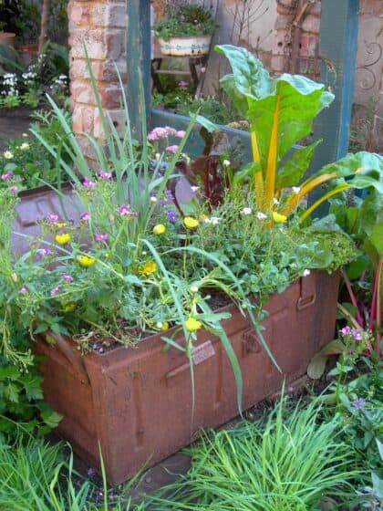 Leafy veggies like lettuce, Swiss chard, beetroot, cabbage, chives and carrots look good with flowers like alyssum, dianthus, marigolds, mini chrysanthemum, snapdragons, verbena and zinnias.