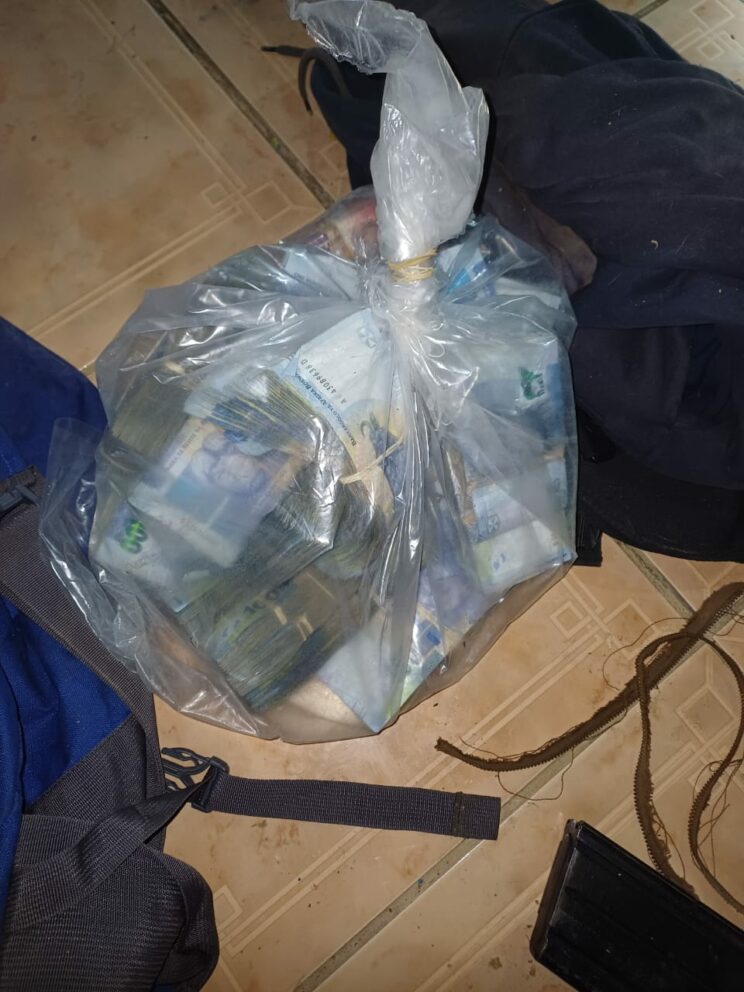 Cash in original money bags, three AK-47 rifles, one R1 rifle, four R5 riffles and 17 magazines, with a large number of live rounds of ammunition, were seized.
