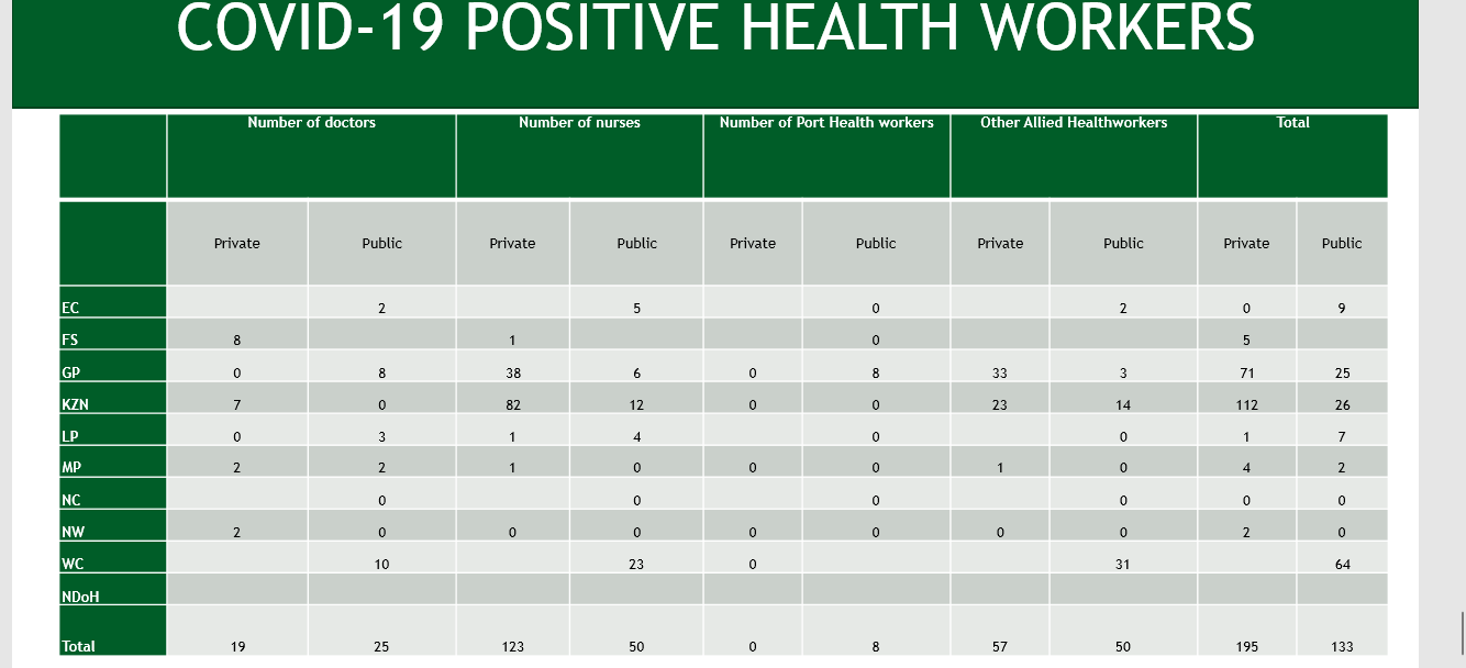 Of the total, 112 of cases were of health professionals in KZN in private facilities, and 26 in public facilities.