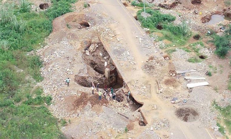 A portion of the roadside has collapsed into a cavernous hole and the surface of the road is punctured with numerous cavities.