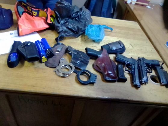 The cache consists of 47 bullets, three 9mm handguns, paper spray, handcuffs, a SA Police Service (SAPS) reflector vest and police cap.