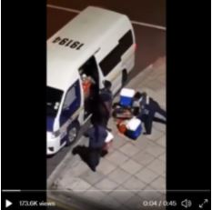 The video shows police officers loading a police van with shopping bags before driving down a street lined with looters and protestors.