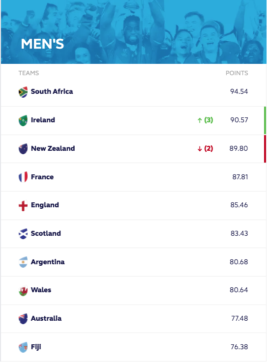 Having gained an almost identical amount of points for their 26-23 bronze final victory over Argentina, England closed the gap on the top four but will still be fifth, 2.27 points behind France.