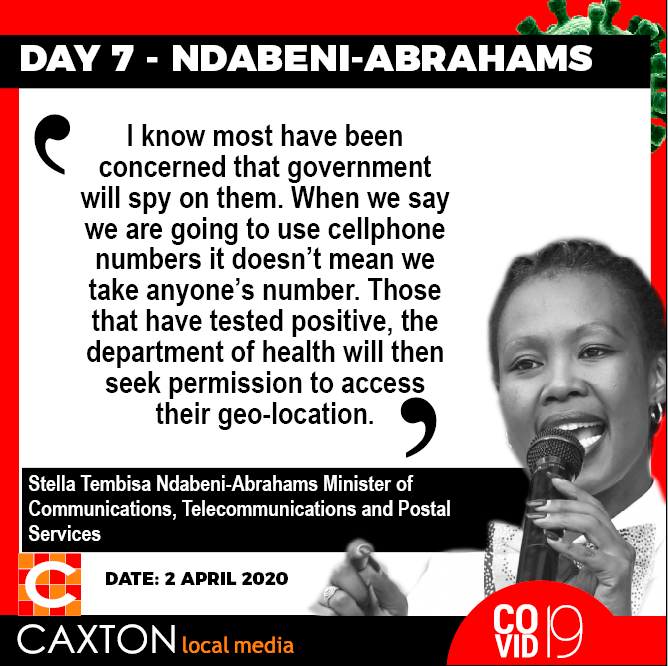 Minister of Communications, Telecommunications and Postal Services Stella Tembisa Ndabeni-Abrahams said while privacy would be ensured, the cellphones of those around an infected person would be traced for testing purposes.