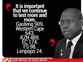 “It is important that we continue to test more and more. The figures so far are: Gauteng 909, Western Cape 643, Kwa-Zulu Natal 489, Eastern Cape 174, Free State 98, Limpopo 24, Mpumalanga 22, North West 22, Northern Cape 16 and an unallocated 18.”