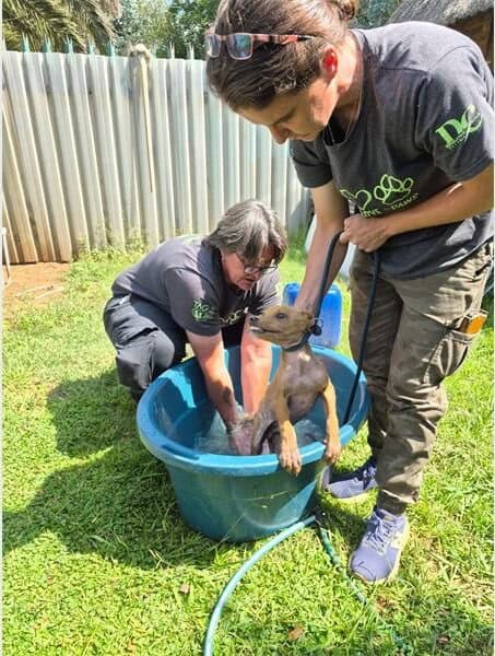 Safely in the care of TAG, both dogs received a gentle medicated bath to treat the mange, a contagious skin disease caused by microscopic parasitic mites that burrow into or live on the skin, resulting in intense itching, hair loss, scabs and thickened skin.