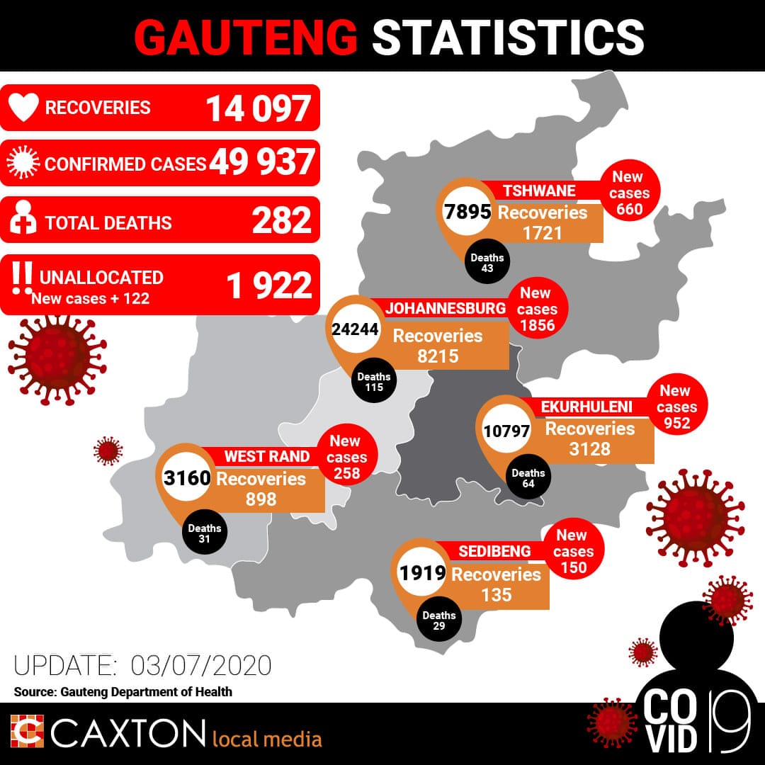 The total number of confirmed Covid-19 cases in Gauteng stood at 49 937 with 14 097 recoveries and 282 deaths on Thursday, according to a statement published by the Department of Health on Friday.