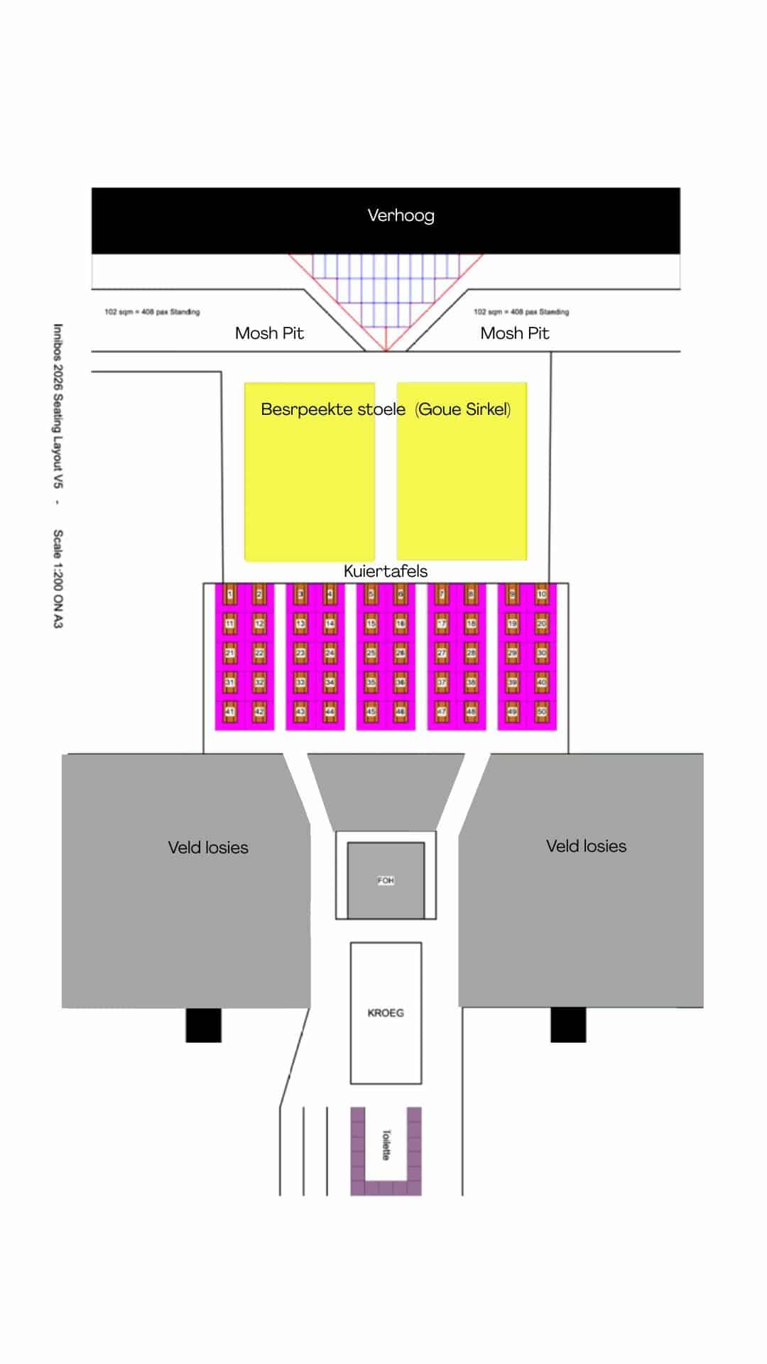 Daar sal elke aand (Donderdag tot Saterdag) 50 kuiertafels vir ses mense elk, asook 540 bespreekte stoele in die Goue Sirkel beskikbaar wees. Vir diegene wat nader aan die aksie wil wees, beloof die mosh pit voor die hoofverhoog – waar oud en jonk die litte kan losgooi – om ’n groot hoogtepunt te wees.