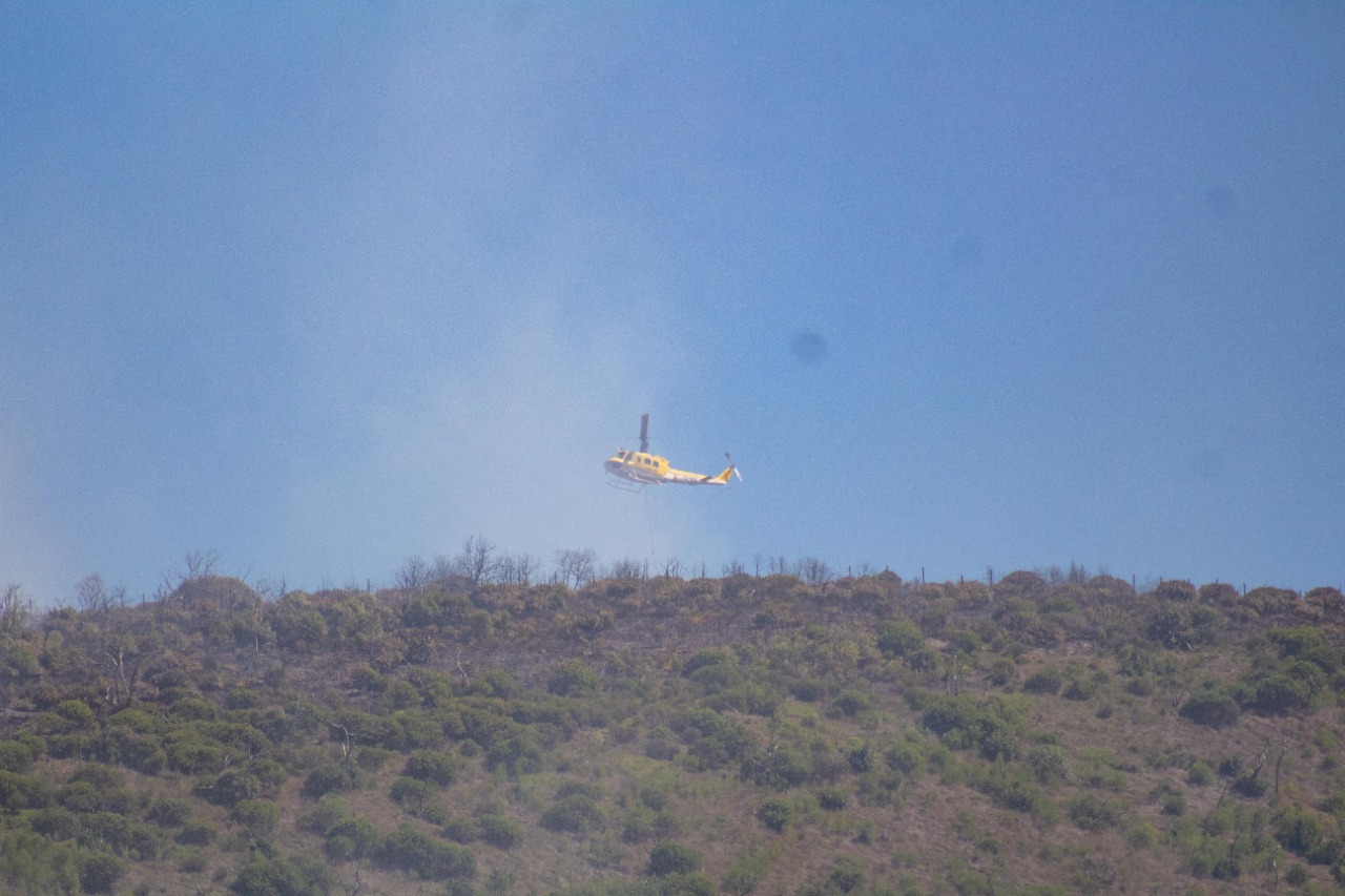 A Working on Fire helicopter is also aiding in fighting the fire, scooping water out of the Knysna Lagoon and carrying it over the head to the blaze.