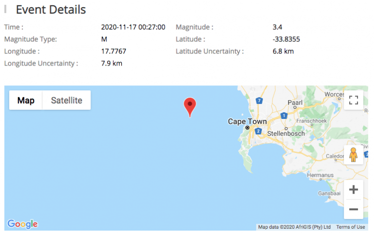 A tremor occurred 60km off the Cape Town coastline, according to preliminary data recorded by the Council for Geoscience.